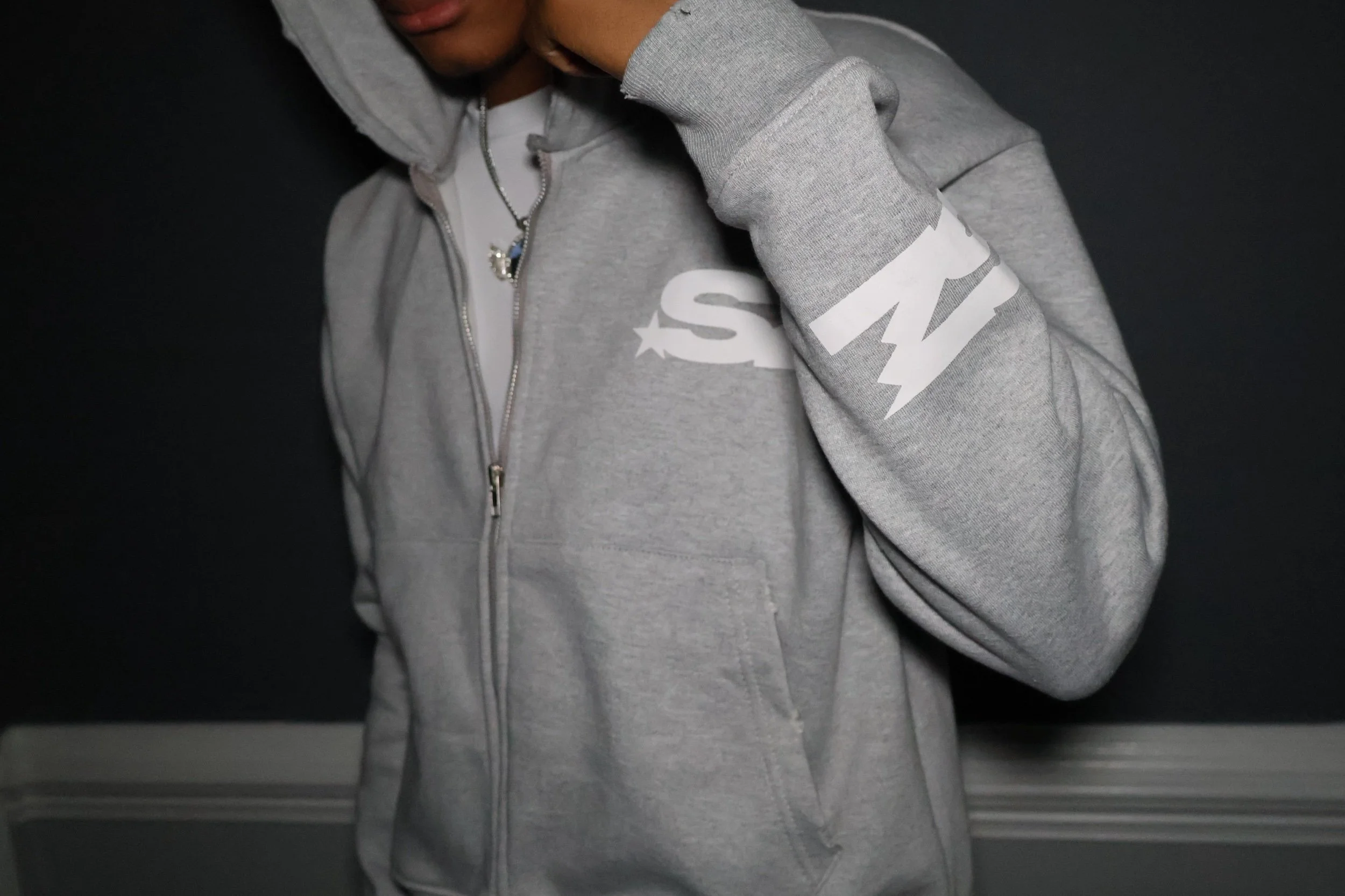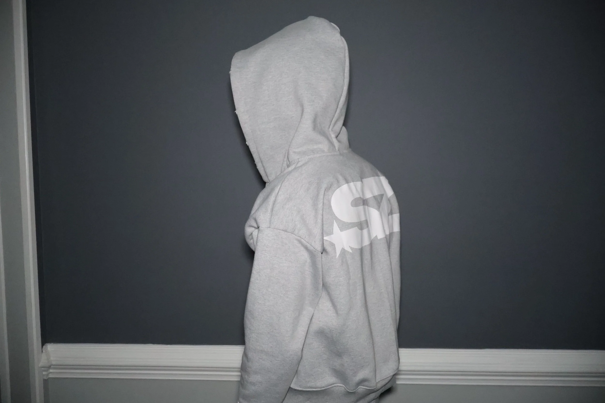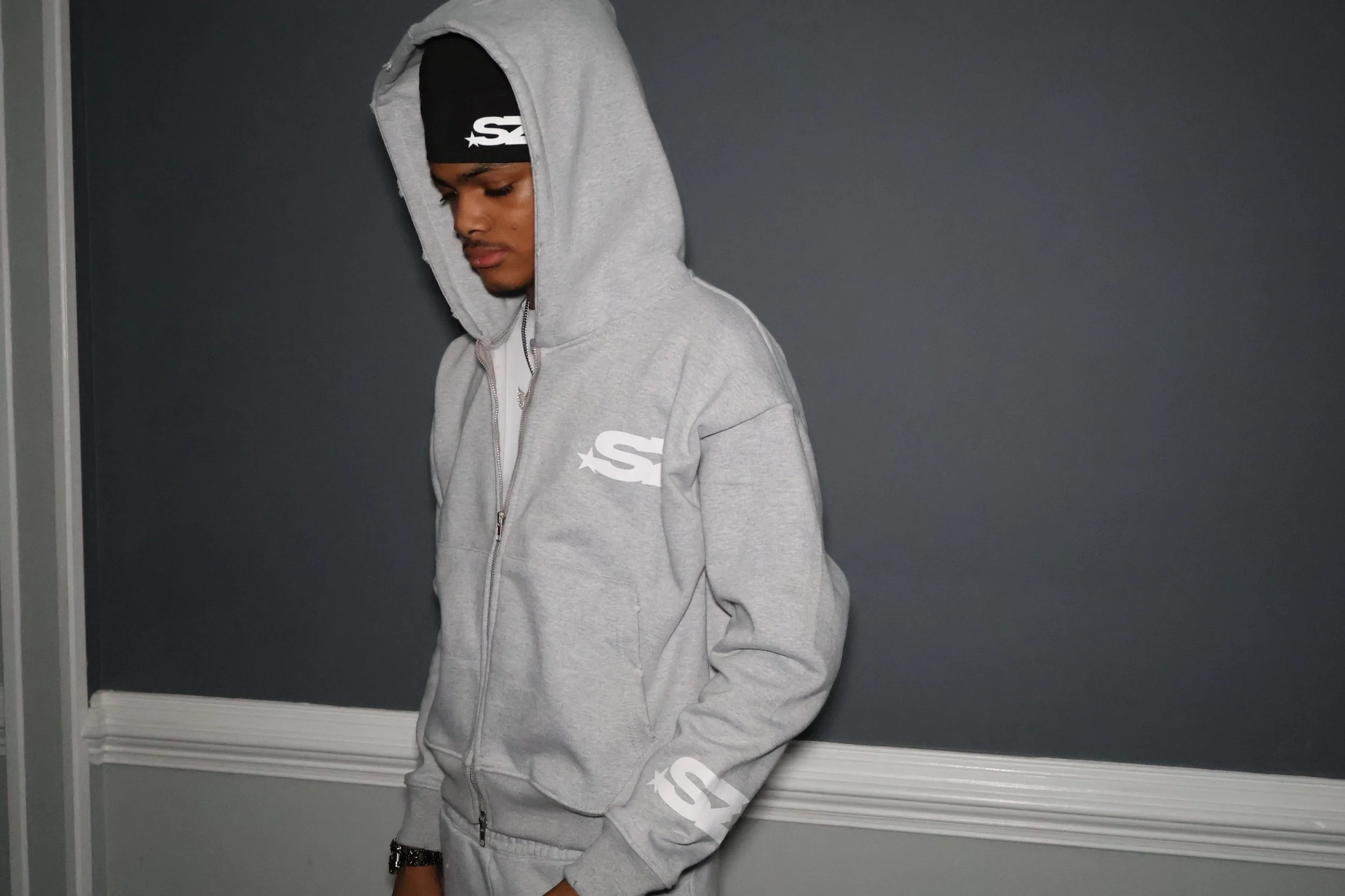 Distressed rips on wrists, hoodie, pockets, and leg openings